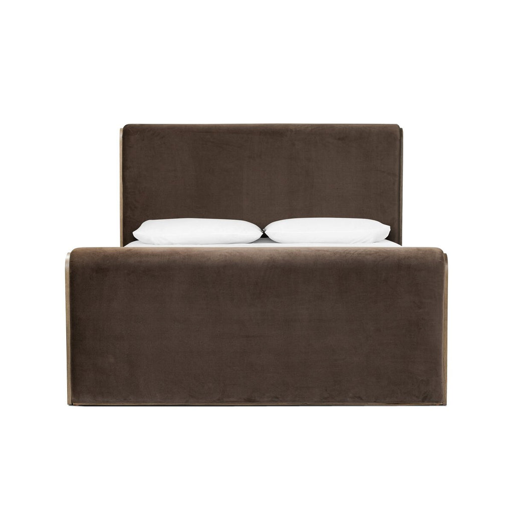 The Loanne King Bed brings a touch of luxury to your bedroom with its rich, chocolate-brown velvet upholstery. The textured feel and smooth finish give it a sophisticated look. For best results, steam occasionally to maintain the smooth appearance.