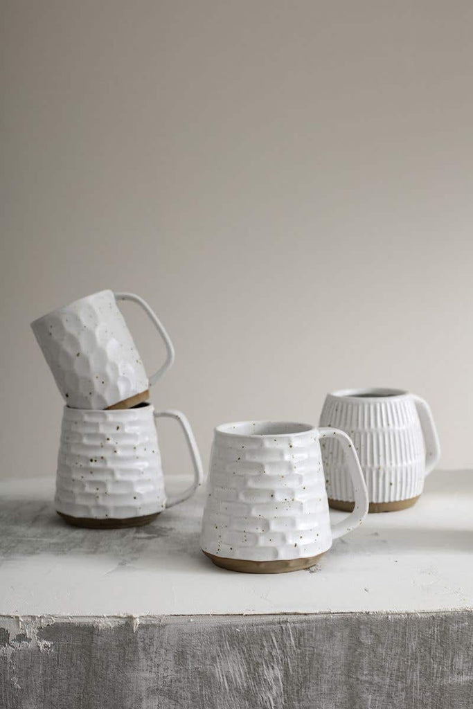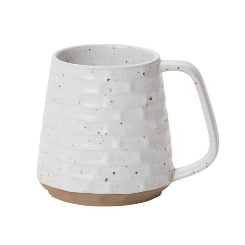 This 16-ounce mug is a perfect combination of geometric pattern and glaze. It features a bold stamped design, a speckled white glaze and raw clay peeking through the bottom to add subtle natural texture. Enjoy your morning coffee or tea with a touch of modern sophistication.