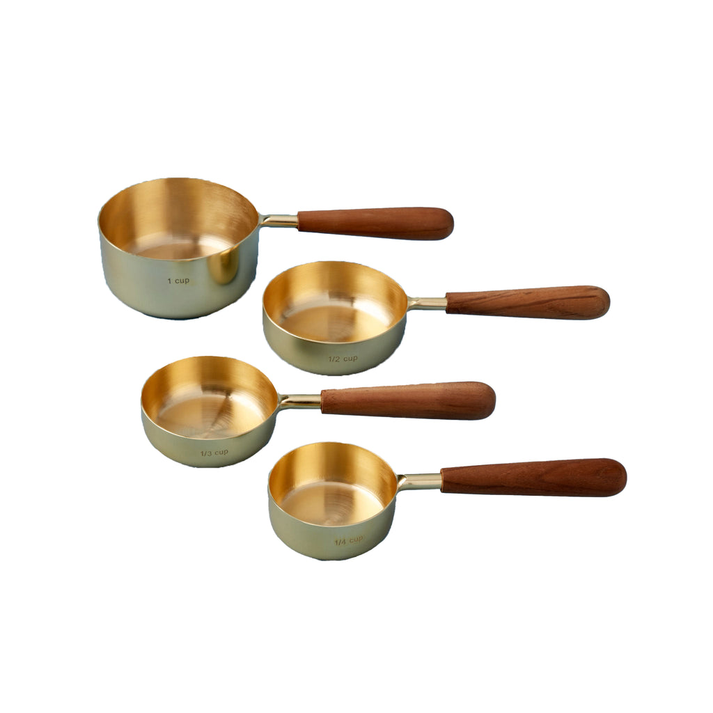 This Gold and Wood Measuring Cup set is the perfect addition to any kitchen. Crafted with a premium gold and wood handle, it offers precise measurements and beautiful presentation. With this set, you can accurately measure ingredients for any dish.